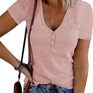 This classic short-sleeved shirt features a button-front design, wide V neck, simple solid color, ribbed knit texture, soft and high-quality stretchy fabric, slim fit, summer tee tops, causal henley style.