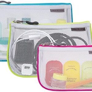 Perfect for cosmetics, sun tan lotions, nail care items, even tech accessories. Mesh front panels allow complete content visibility. Colorful accent piping gives pouches their structure. Three staggered sizes allow pouches to be nested for compact storage. Top zip pouch is made from water-resistant ripstop material that wipes clean, keeping pouches looking like new.