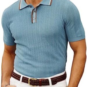 Features: Mens polo shirts featured with herringbone texture and ribbed pattern, lapel collared and 3 buttons placket with trims design, short sleeve, ribbed cuffs and hem make you look more capable and neat, basic and stylih styles